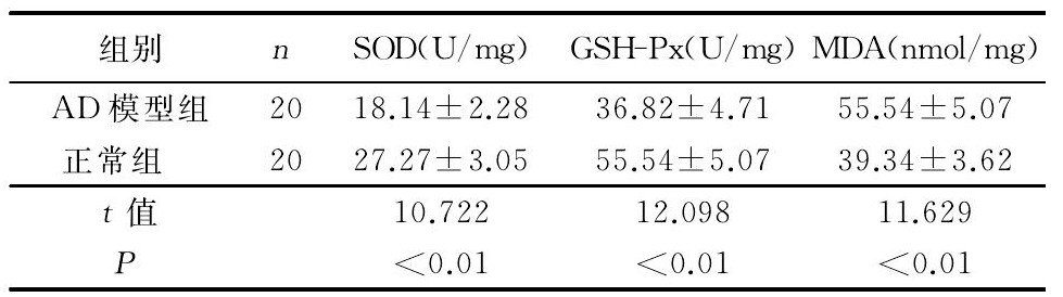 與正常組對應(yīng)的3個指標(biāo)比較, AD模型組SOD、GSH-Px活性明顯降低, 而MDA含量明顯升高。詳見表1。