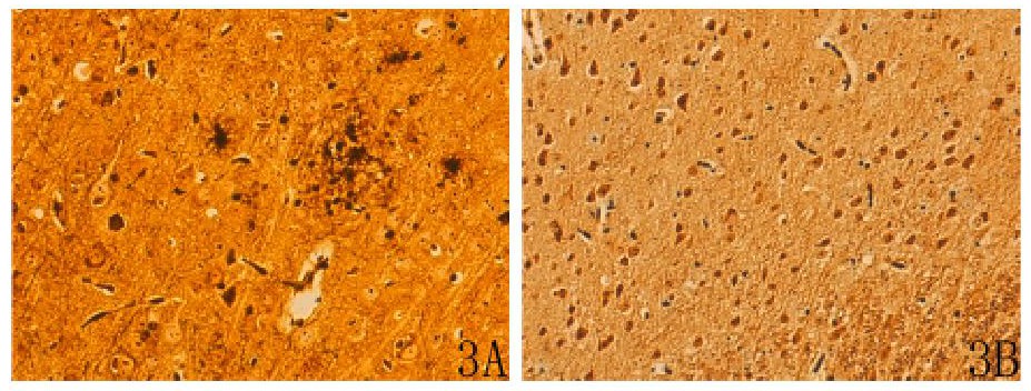 改良Bielschowsky氨銀液染色結(jié)果:AD模型組海馬CA2區(qū)可見錐體細(xì)胞排列不整齊、稀疏、萎縮、核固縮, 核周體內(nèi)棕黑色細(xì)絲增粗、呈小塊狀;軸突內(nèi)神經(jīng)元纖維模糊不清;神經(jīng)元外可見Aβ斑或老年斑, 體積較大、數(shù)量較多, 且周圍有浸潤的膠質(zhì)細(xì)胞及變性的神經(jīng)元 (圖3A) 。正常組海馬CA2區(qū)錐體細(xì)胞的細(xì)胞質(zhì)內(nèi), 可清晰地看到棕黑色的細(xì)絲狀結(jié)構(gòu)即神經(jīng)原纖維, 在核周體內(nèi)交織成網(wǎng), 并伸入樹突和軸突;神經(jīng)元外未見Aβ斑或老年斑 (圖3B) 。詳見圖3。
